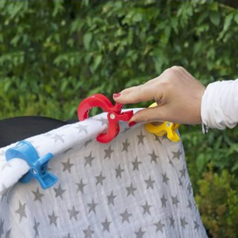 The Pram Pegs 4pk are the perfect accessory for securing muslin swaddles to your pram, ensuring your baby stays shaded and comfortable during outdoor adventures.