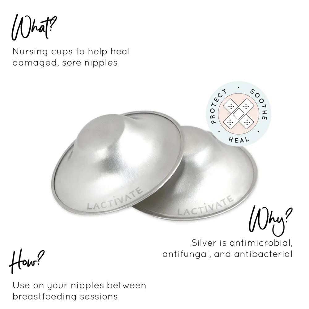 Handcrafted from 925 sterling silver and 100% nickel free, Lactivate® Silver Nursing Cups are designed to be used between breastfeeding sessions instead of nipple cream to help protect, soothe and heal damaged nipples.