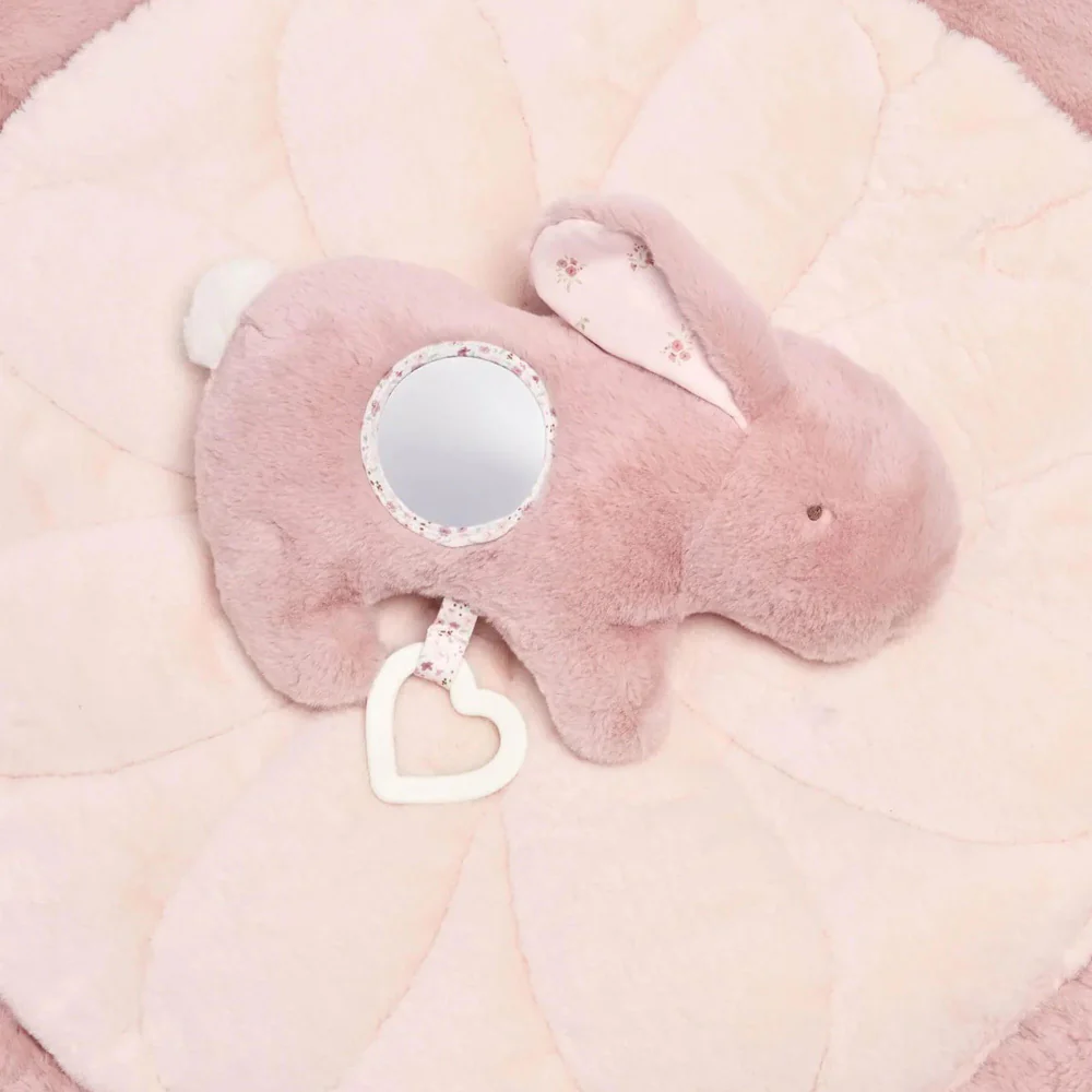The perfect spot to lay and chill or indulge in some playtime! From the supersoft faux fur base - padded for extra comfort - they can relax; be entertained by hanging toys and a musical heart; practice some Tummy Time with a little help from bunny, or soothe themselves with the textured teether.