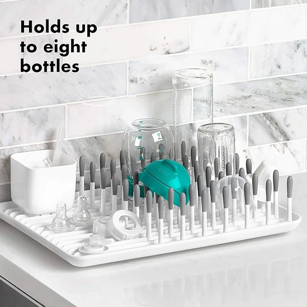 Items set out to dry don’t have to sit in a pool of water, thanks to the raised ribs on the bottom of the Bottle Drying Rack. Additional space at the front is useful for small parts. A removable cup, ideal for utensils, straws and medicine droppers, attaches in multiple places.